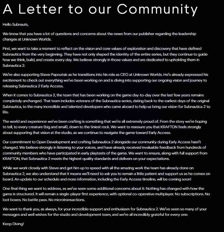 这份发布在Unknown Worlds官方网站上的声明,提到了关于领导层变动的所有疑问和担忧。声明首先指出,《深海迷航2》中探索与发现的核心价值观依然得到坚守,整个团队都支持Papoutsis,而他本人也在“支持”着《深海迷航2》的愿景。