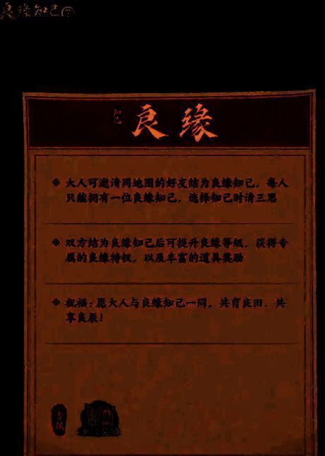 一旦你的角色等级达到正八品下2阶并且解锁了知己轩建筑,这时“良缘知己”的大门就会向你敞开。你将能够邀请同地图上的好友共同结成知己,值得注意的是,每位玩家只能选择一个知己伙伴,必须三思而后行,毕竟这是一次特殊的盟约,选择合适的人一起走这一段路显得尤为重要。