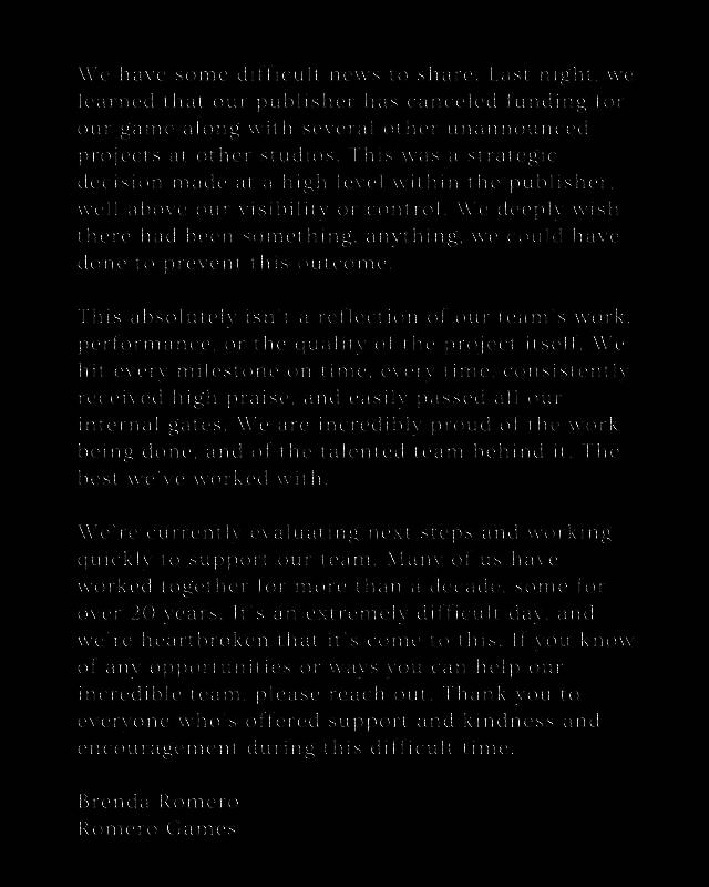他说他们游戏的发行商取消了资金赞助,一同取消的还有多个其他工作室的未公布游戏项目。他说这一决定就是发行商内部高层拍板做出的战略决定,他们工作室自己也无能为力,已经超出了工作室的可见性和控制范围。