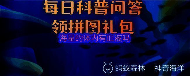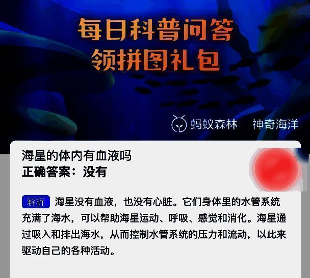 支付宝蚂蚁森林神奇海洋2025年7月4日问题已经更新,今日题目是:海星的体内有血液吗?正确答案是:【没有】。海星没有血液,也没有心脏。它们身体里的水管系统充满了海水,可以帮助海星运动、呼吸、感觉和消化。