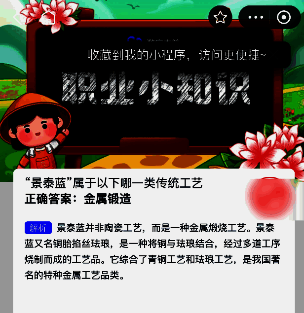 “景泰蓝”属于以下哪一类传统工艺?这是支付宝蚂蚁新村2025年7月4日题目,每天在蚂蚁新村答题,可以提高木兰币的产速,帮助小镇建设。点击正确答案,就会获得“产速+3/时”,答错了只有“产速+1/时”的效果。今天正确答案是【金属锻造】。景泰蓝并非陶瓷工艺,而是一种金属煅烧工艺。