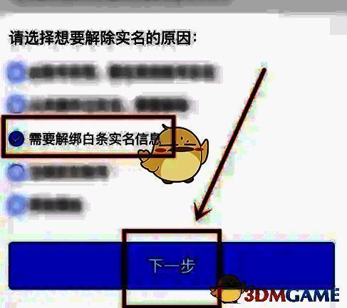 3、在实名解除页面中,输入信息后,选择解除实名的原因后,点击【下一步】;