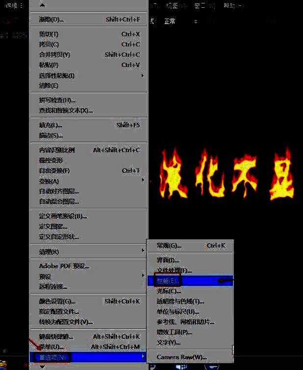 1.首先,打开界面后,在编辑菜单的首选项栏目中,点击性能按钮