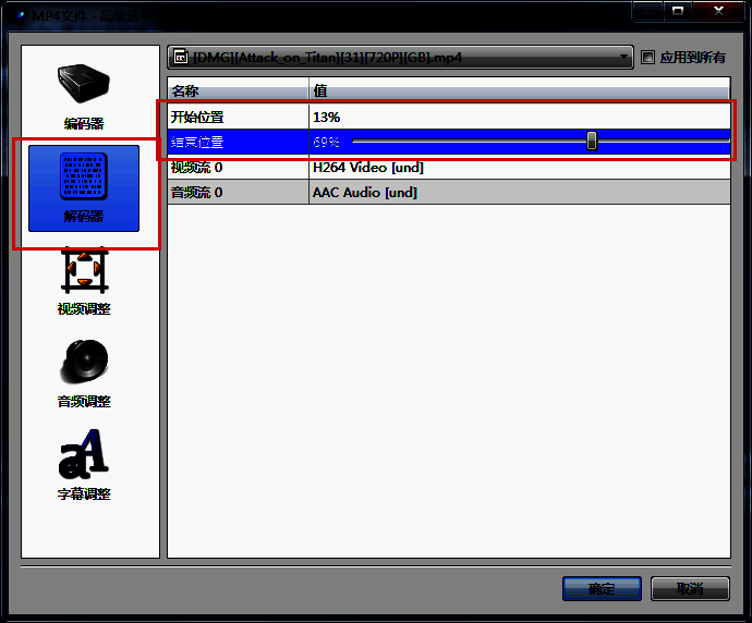 4、接着在“高级选项”界面的左侧打开“解码器”,之后在右侧通过调整“开始位置”和“结束位置”即可设置截取视频的区域了;