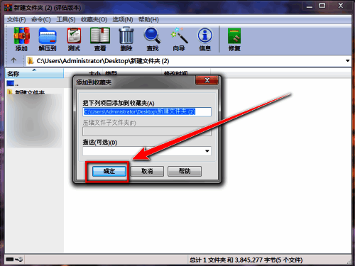 第五步:在“添加到收藏夹”的窗口里,点击“确定”,即可将文件夹收藏到winrar中。