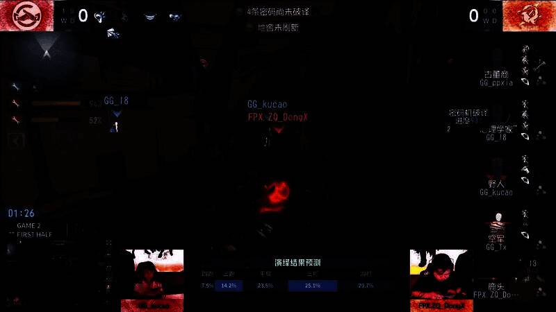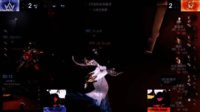 第一天FPX.ZQ vs MRC第二局下半局, FPX.ZQ_DongX红蝶守椅战翻盘四抓,终结比赛:开局FPX.ZQ_DongX红蝶干扰火灾调查员后选择架点追击调酒师,在与调酒师的博弈中,调酒师先二连砸板,后FPX.ZQ_DongX稳健抽刀将其击倒,密码机进度两台半。守椅战中,FPX.ZQ_DongX先在外围拦到佣兵,击倒调酒师后活用通缉,细节骗飞轮,贪到火灾调查员一刀,导致求生者二救调酒师不成:FPX.ZQ_DongX在外围排到佣兵位置,半状态火灾调查员欲偷人但FPX.ZQ_DongX嗅觉灵敏,及时回防,将其击倒秒续节奏。FPX.ZQ_DongX闪现拦截杂技演员救人,换挂杂技演员,双方拉扯,FPX.ZQ_DongX确认密码机还差半台后深入追击火灾调查员将其淘汰。双人开门战,FPX.ZQ_DongX挂完人后精准排到杂技演员位置,完成四抓。