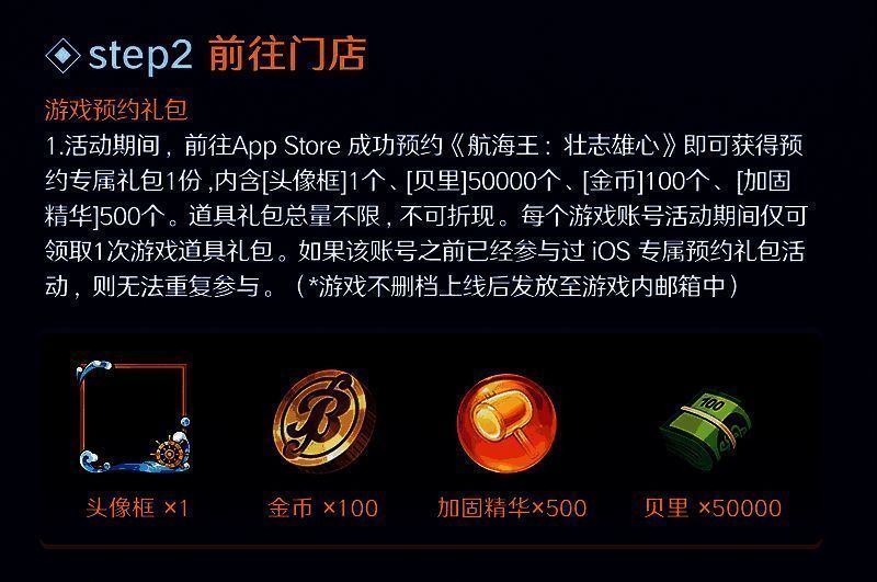 1.活动期间,前往App Store 成功预约《航海王:壮志雄心》即可获得预约专属礼包1份,内含头像框x1、贝里x50000.金币x100、加固精华x500。道具礼包总量不限,不可折现。每个游戏账号活动期间仅可领取1次游戏道具礼包。如果该账号之前已经参与过 i0S 专属预约礼包活动,则无法重复参与。(游戏不删档上线后发放至游戏内邮箱中)
