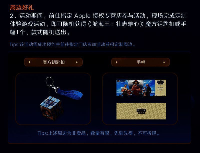 2.活动期间,线上成功预约后,前往指定 Apple 授权专营店参与活动,现场完成定制体验游戏活动,即可随机获得《航海王:壮志雄心》魔方钥匙扣或手幅1个,款式随机送出。魔方钥匙扣,共计8万份,本门店X份。手幅共1个款式,共计38万份,本门店X份。活动期间,上述周边为非卖品,无市场销售价格,数量有限,先到先得,不可折现。