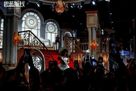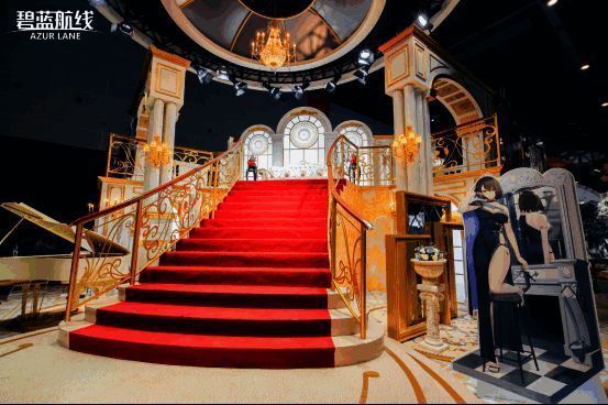 本届CP30,《碧蓝航线》带来了展会现场最典雅浪漫的展台。一踏入展区,映入眼帘的是一条铺着长长红毯的阶梯,仿佛引领着指挥官正步入一个充满故事的中世纪欧洲宫廷晚会。整个空间以白色为主色调,搭配金色的装饰和家具,在灯光的映衬下营造出一种庄重而奢华的氛围。纯白的钢琴、金色的壁钟壁炉以及错落有致的《碧蓝航线》角色立牌则为整个空间增添了几分浪漫色彩。