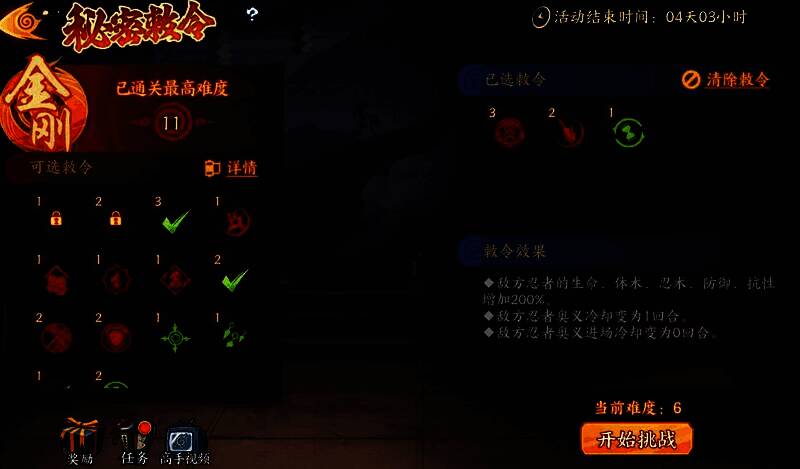 在《火影忍者:忍者新世代》中,秘密敕令是一种拥有不同变化和难度的玩法。每个关卡都有不同的“敕令”,选择不同类型的“敕令”后,会有不同的限制,让关卡挑战的难度变得更高,需要运用不同的忍者阵容来进行挑战!快来一起学习如何轻松通关吧!