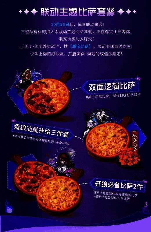 即日起登录美团/美团外卖App搜索尊宝比萨,即可进店领取品牌专属红包,超值优惠畅享狼人杀联动主题比萨套餐,选择外送到家,足不出户