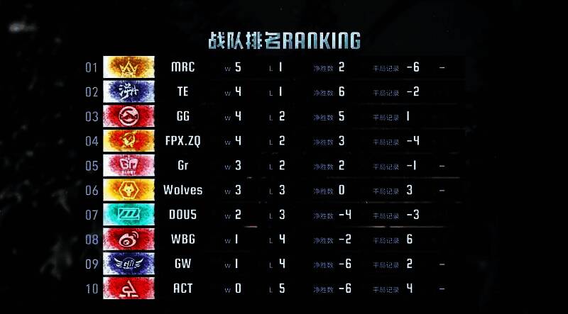 本周赛程走向多出人意料,Gr求生者这周发挥欠佳,多次被三抓四抓,而成都Wolves选手手感火热,拿下比赛;TE战队2:0一举攻克强敌FPX.ZQ也叫人眼前一亮,排名直追成都GG和FPX.ZQ,可见本赛季季后赛胜者组竞争激烈,没有所谓稳定的强队,大家你来我往互不相让。本周积分排名如图: