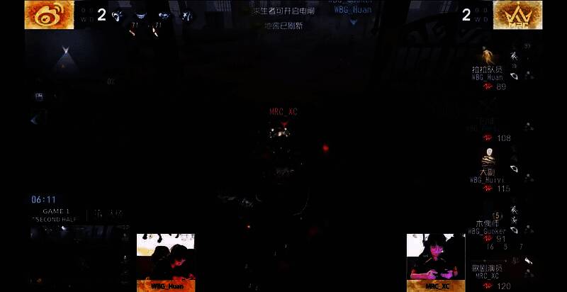 第一天MRC vs WBG第一局下半局,MRC_XC歌剧演员开门战拦门,成功三抓:MRC_XC歌剧演员开局在医院大门处追击“囚徒”,成功博弈抽刀,又精准把控对手心理,头铁过板,开局一分钟击倒“囚徒”。两轮救人后来到三人开门战,MRC_XC快速击倒大副将其二次挂上椅,与拉拉队员在已经开的大门前博弈,拉拉队员交道具欲冲门,MRC_XC便底牌切传送威慑;一轮拉扯后,拉拉队员再次利用窗弹冲门,歌剧演员就回溯拦截。最后MRC_XC成功将拉拉队员堵在双板区,抽刀成功将其击倒。