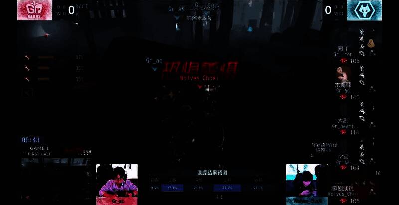 第三天 Gr vs Wolves第一局上半局,Wolves_ChoAi歌剧演员果断底牌切失常,拿下四抓奠定胜利:Wolves_ChoAi歌剧演员追击木偶师,两次失惧拿刀后将木偶师逼到短板,影域博弈到震慑,一台密码机进度快速击倒。空军和大副两次救援后,木偶师淘汰时密码机分散但是总进度只差约一台。Wolves_ChoAi先来到中场遗产机逼完大副的道具,假意离开后回溯,击倒大副,挂在遗产机旁,果断底牌切失常扩大优势,在外围拦到园丁,深入追击击倒换挂,最后还是选择继续追大副失常守遗产拿下四抓。