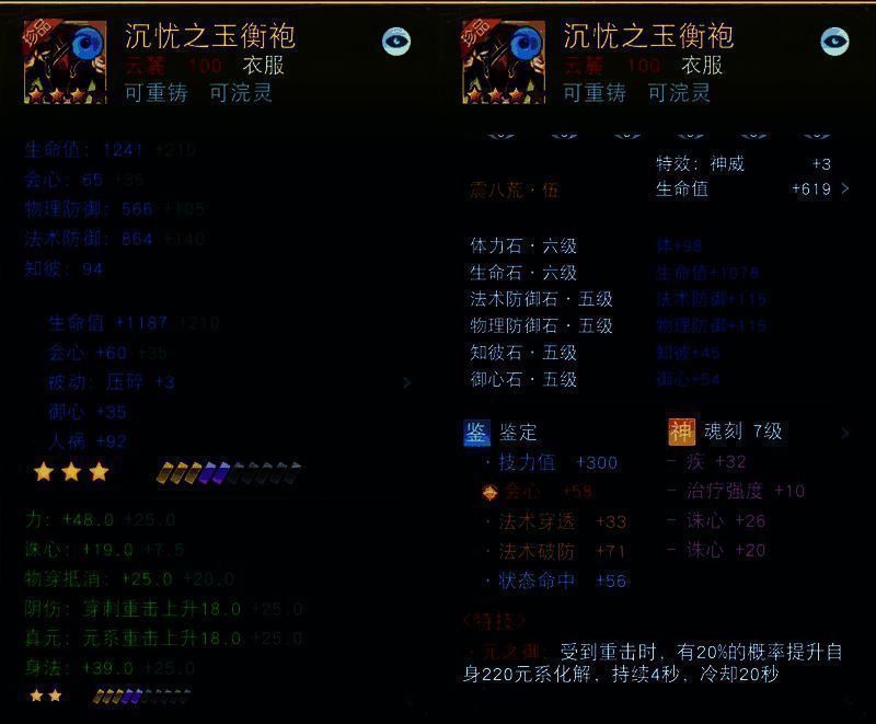 魂刻的话就利用每周的免费材料去洗,尽量洗出双高级属性;炼化则用三才石洗,等出了高级属性就可以继续炼化下一件;鉴定方面我则会着重挑选拥有三条优质属性的符购买,像双穿透+破防、双破防+穿透或双会心大攻之类的都可以爽快入手。