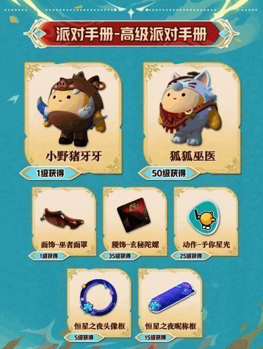 将派对手册升级为高级后,还能获得总价值3288蛋币的超值奖励。除了300蛋币、30彩虹币、20盲盒染色剂、20配饰染色剂外,还可获得稀有盲盒“小野猪牙牙”、典藏配饰“巫者面罩”、稀有头像框“恒星之夜头像框”、高级昵称框“恒星之夜昵称框”、典藏动作“予你星光”、典藏配饰“玄秘陀螺”和稀有盲盒“狐狐巫医”外观。