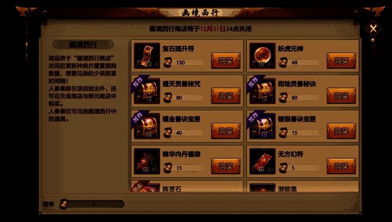 画境西行商店于11月1日-12月31日期间开放,为期两个月。此次活动代币更新为人参果,在此期间,少侠们完成十一、十二月内的任意主题月活动、在元宝商城或绑元商城购买都可获得人参果。