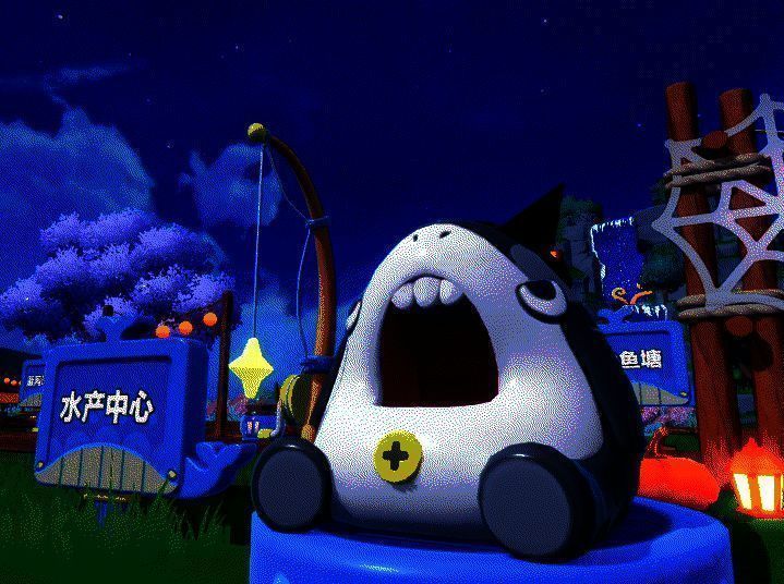 同时,水产中心也换上了万圣节主题装扮,入口的围栏挂起了闪闪发光的南瓜灯串,金黄可爱的南瓜头和吊灯点缀垂钓台,就连小鲨鱼也戴起了巫师帽,万圣氛围拉满!
