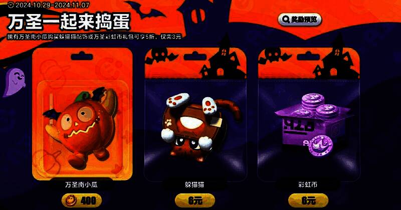 听说不给糖就捣蛋,南瓜小精灵速速来送惊喜啦!10月29日零点,万圣节惊喜小礼包准时降临!外观“万圣南小瓜”掉落,仅需400蛋币;喵喵神教必备躲猫猫背饰,限定可爱新品,六元即可入手;超值彩虹币礼包,6元收获12枚彩虹币!加量不加价!如果已经拥有/购买南瓜外观可解锁惊喜特惠,躲猫猫背饰和彩虹币礼包尽享五折,仅需3元~