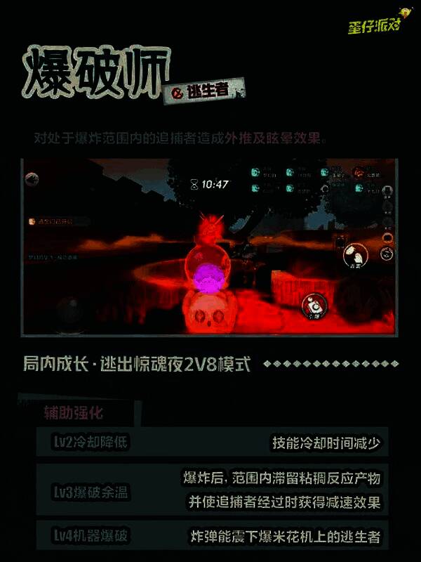 爆破师在逃出惊魂夜2v8模式中也有自己的局内成长曲线,小蛋仔们可根据成长方向,在不同的阶段制定不同的对局战略!