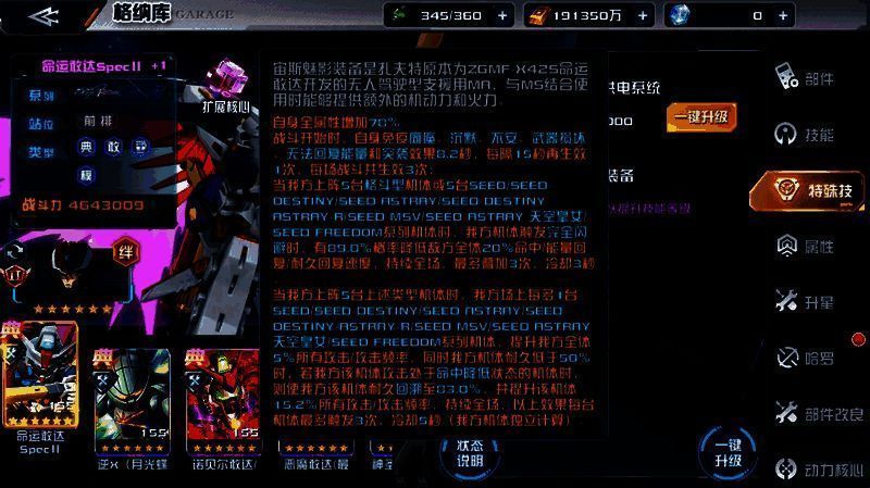 命运敢达SpecⅡ具备多重负面效果解除技能,使用【旋转光束斩】【光束穿刺】技能不仅能够对敌方全体造成伤害,还可以解除自身和我方能量最高的2台机体无法回复能量效果及我方全体无法回复耐久效果。