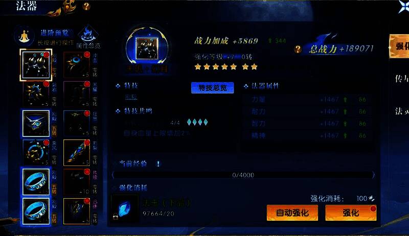 可以通过强化进阶获得大量战力和仅在天界内生效的进阶技能和法器特技,