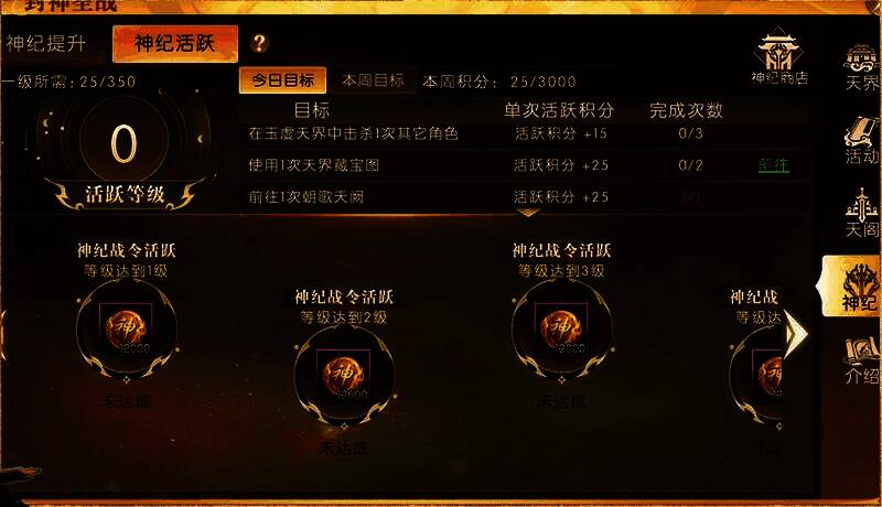 在神纪活跃界面中,完成今日目标和本周目标,即可获得大量的活跃积分。