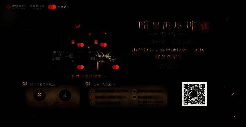 永恒超燃,尊享权益!《暗黑破坏神:不朽》×中信银行联名,中信银行和万事达全国首家发布的双币借记卡现已正式开启办理。11月11日前预约过世界卡的玩家,即日起前往指定网点即可开卡并激活。今日8:30-23:59开卡并激活暗黑联名世界卡的持卡人还有机会参加抽奖活动,抽取《魔兽世界》联动双形态传奇时装【背叛者之罪】(限50份),化身伊利丹!而未参加预约的玩家,于今日8:30-23:59办理并激活暗黑联名白金卡,同样可以参与抽奖,抽取《魔兽世界》联动典藏版灰烬使者武器皮肤(限50份)。其他日期开卡并激活联名卡的持卡人,则会获得一次抽取十连强化不朽钥石(限500份)的机会。