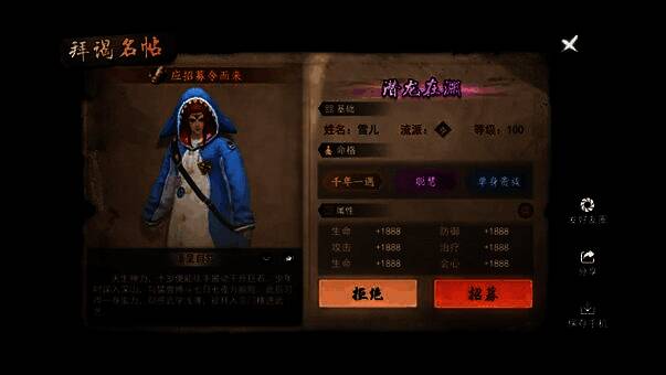 当少侠开放宗门后,会有慕名而来的弟子不定时上门拜谒,少侠可以查看拜谒名帖,了解弟子的身份信息,从而选择心仪的弟子招募入门。