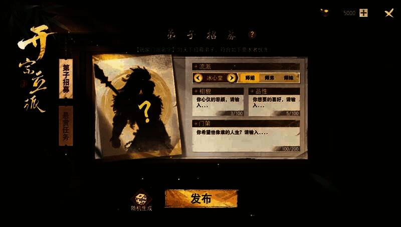 此外,少侠们还可以总结自己理想弟子的形象、性格、出身等特征,甚至还可以自定义TA的名字,完成招募令的填写发布后,AI大数据将会为少侠创造更加符合要求的弟子!