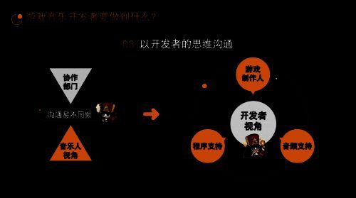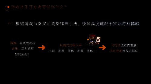 一个优秀的音乐人,并不一定能成为优秀的游戏音乐创作者,相反这往往只是游戏音乐创作路上的起点。宫奇在演讲中强调,一个优秀的游戏音乐人,一定要是一名“复合型人才”。并且列出了三个特质——能够根据实际的游戏使用环境来作曲、能将音乐以精巧的设计和规则放入游戏或影片、对结果负责。