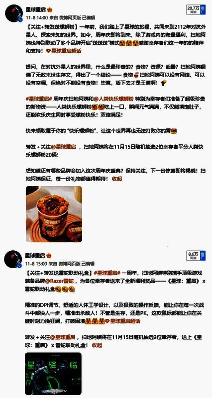 11月16日18:30,《星球:重启》抖音官号也会开启周年庆典直播活动,狂送千元现金福袋,来和扫地阿姨一起度过一个美好的庆典之夜吧!