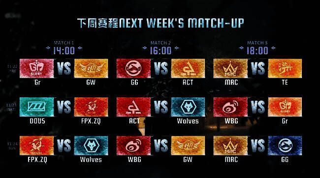 本周发挥出色的FPX.ZQ战队将连续遇到竞争季后赛席位的DOU5和Wolves战队,谁能将火热的状态延续下去,在常规赛末段的竞争中占得先机?本周状态起伏较大的MRC主场迎战持续低迷的TE战队,谁能率先走出失利的阴霾?敬请锁定下周五14:00的第五人格赛事官方直播间。