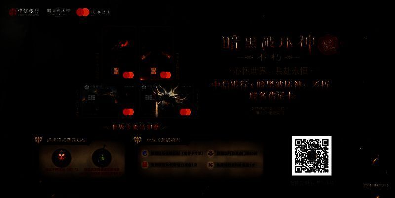 彰显尊贵身份,不朽玩家专属!中信银行和万事达全国首家发布,《暗黑破坏神:不朽》×中信银行联名双币借记卡正火爆办卡中!该卡支持微信/支付宝绑卡及境内外便捷使用,现在办卡并激活即可享受覆盖衣食住行等多方面的专属特权,不仅能获得更加尊贵的使用体验,还有多重游戏内好礼回馈!更有《暗黑破坏神:不朽》中信银行主题网点以及惊喜活动等待各位玩家,现在扫描下方二维码参与活动,让你不虚此行!