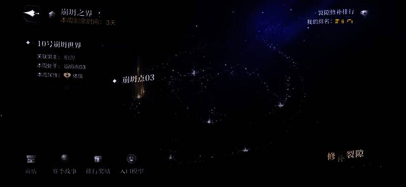 在崩坍点内,玩家可能遇到不同属性的崩坍裂缝,需要玩家进行修补。修补挑战随赛季故事每周更新,挑战得分达到对应的分段目标,每周一0:00-8:00,系统将对上周修补挑战结果进行結算。处于不同排名段的玩家,可获取对应的时之华和旧日影像奖励,奖励通过邮件发送。