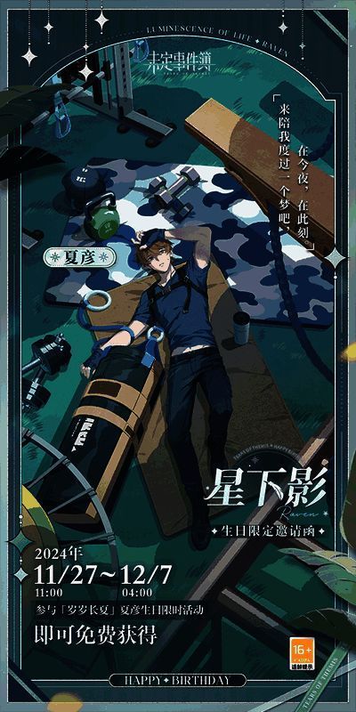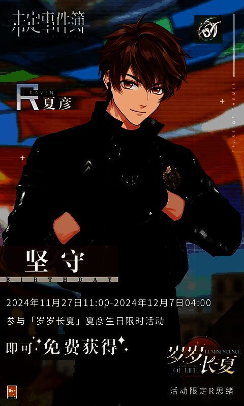 「岁岁长夏」夏彦生日系列活动已近尾声,精彩活动剧情、多重生日奖励今日解锁。11月27日起,「岁岁长夏」限定剧情解锁。完成生日限时任务可获得夏彦R思绪【坚守】、生日限定邀请函【星下影】、活动纪念徽章【岁岁长夏】及【女神之泪】等多重限定奖励。此外2024年12月5日00:00至12月11日23:59,登录游戏还可获得生日专属电话【岁岁长夏】。