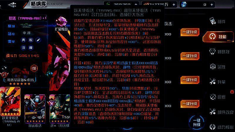 妖天使敢达(TRANS-AM)具备多重负面效果解除技能,使用【反射与思考的融合】特殊技,可以使自身免疫瘫痪、沉默、不安、武器损坏、无法回复耐久和劈刺效果。并可使敌方全体机体受到无法驱散的无法回复耐久/无法回复能量效果,并追加其他全体负面效果。
