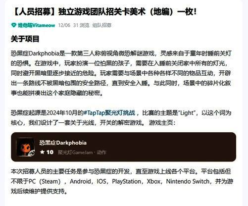 以此次参赛为契机,“维他喵Vitameow”主创团队已经开始在TapTap《恐黑症Darkphobia》的游戏论坛进行人员招募,并将本次聚光灯GameJam视为起点持续开发,力求未来把《恐黑症Darkphobia》正式带到各个游戏平台。