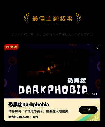 本次游戏创作挑战赛中,万众瞩目的「最佳游戏」由被试玩玩家打了10星好评,灵感源于“童年睡觉前关灯恐惧”的第三人称俯视角微恐解谜游戏《恐黑症Darkphobia》获得。