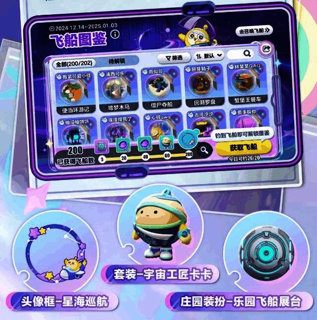 圆宇宙间穿梭的乐园飞船,也满载着给小蛋仔们的福利。12月14日(周六)-1月3日,尽可能多地收集获取飞船吧!游玩飞船对应的地图,即可解锁该飞船图鉴。获得并解锁50个以上飞船图鉴后,仅需获得飞船就能自动解锁图鉴。更可免费解锁套装“宇宙工匠卡卡”、头像框“星海巡航”等奖励。