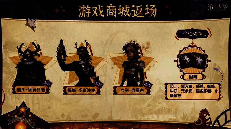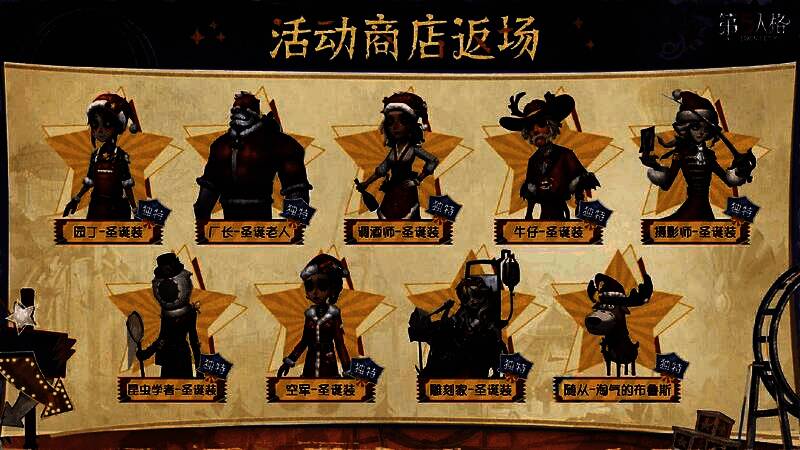 除了今年全新的活动奖励,往期活动限定时装【独特时装】园丁-圣诞装、【独特时装】厂长-圣诞老人、【独特时装】调酒师-圣诞装、【独特时装】牛仔-圣诞装、【独特时装】摄影师-圣诞装、【独特时装】昆虫学者-圣诞装、【独特时装】空军-圣诞装、【独特时装】雕刻家-圣诞装和【独特随从】淘气的布鲁斯已返场上架活动商店;此外,【奇珍时装】鹿头-圣诞狂鹿、【奇珍时装】孽蜥-圣诞沙龙、【奇珍时装】大副-寻星者和【个性动作】回响(园丁、昆虫学者、咒术师、牛仔、邮差、蜘蛛、爱哭鬼、小提琴家)也会在游戏商城返场,感兴趣的访客们抓紧机会选购!