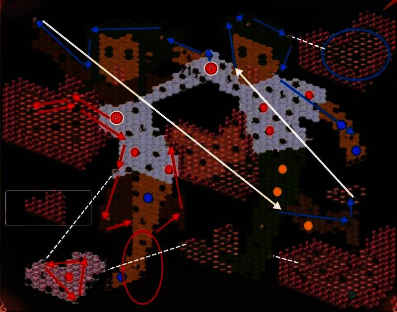 (4)争夺排行榜核心思路依靠1队(红色箭头,后续简称1队),2队(蓝色箭头,后续简称2队),3队(黑色箭头,后续简称3队),以最快速度集齐8个“远征”主题徽章(白点);