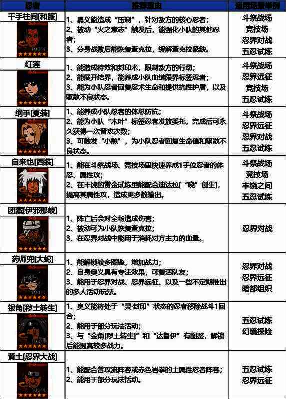 a、以上远征忍者的推荐理由仅供参考,不分先后,需要根据不同的环境和自己所拥有的忍者进行合理选择搭配;