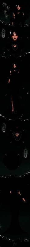 少女墨色长发微鬈,以玫瑰发饰半束于脑后,鬓边缀有黑羽与绒球,精致典雅。颈部黑色镂空薄纱与珍珠项链相互搭配,增添了几分华贵之气,墨绿色缎面旗袍勾勒曼妙身姿,其上以金线绣制了细密的金色纹样,墨色毛裘披肩环绕肩侧,更衬得她气度不凡。裙摆采用了珍珠包边设计,下接曳地黑纱,流苏链条自裙摆分叉处垂坠而下,行走间伶仃作响,不经意间便透出万种风情~