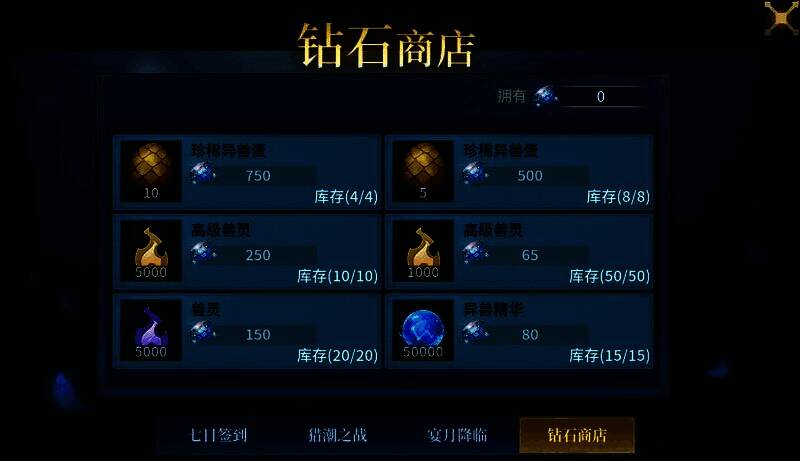 活动期间将限时开放钻石商店,玩家可使用钻石兑换珍稀异兽蛋、高级兽灵、兽灵、异兽精华,帮助玩家快速养成异兽。