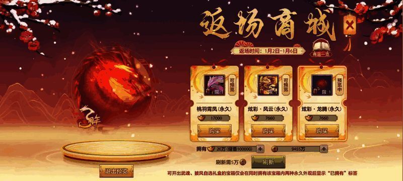 注:新年返场商品可使用元宝或储备元宝进行购买。