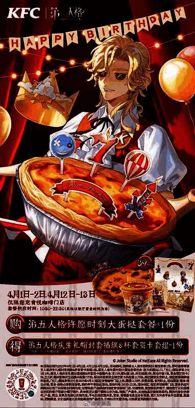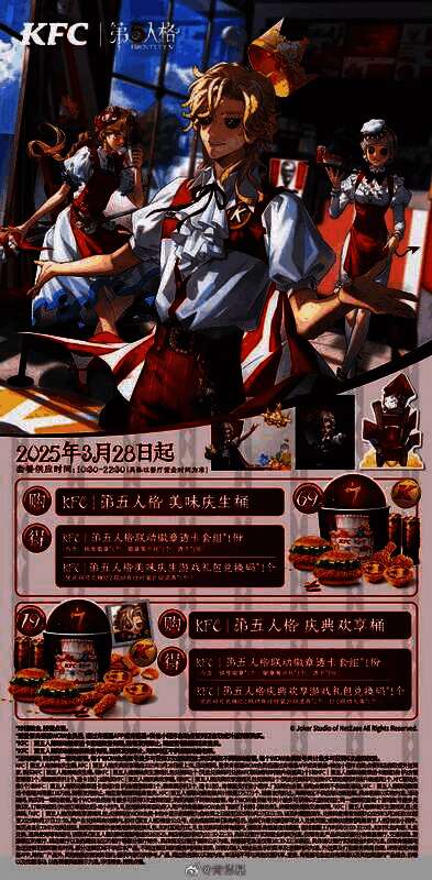 美味庆生,庆典欢享!网易首款1V4非对称竞技手游《第五人格》与肯德基联动第三弹即将开启,3月28日联动套餐正式发售,全国400多家联动主题店也将换装上线!