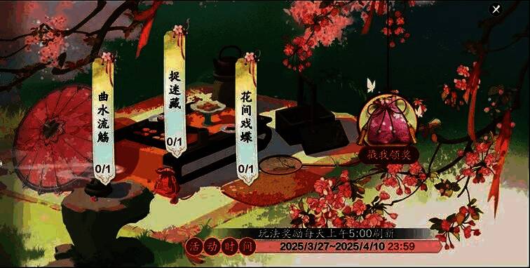 明日(3月27日)-4月10日23:59:59,参与【花朝节-花间戏蝶】和【花朝节-曲水流觞】活动,即可领取天衣礼券、焕彩之砂、随心染匣等好礼!