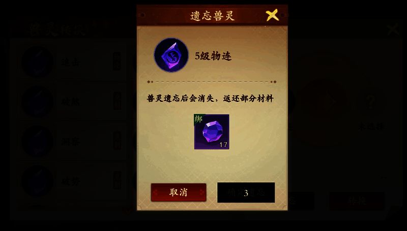 兽灵和特殊兽灵遗忘会返还部分升级材料(不同等级返还的材料数量不同),返还的道具为绑定道具。