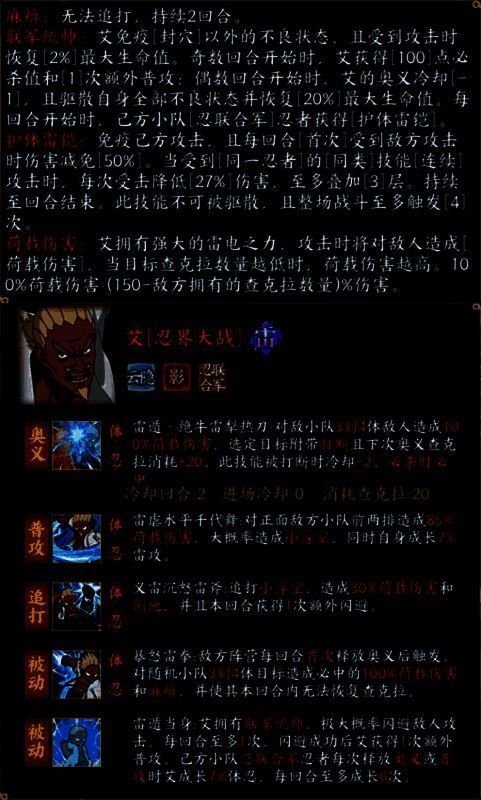 被动Ⅱ:雷遁当身:艾拥有联军统帅,极大概率闪避敌人攻击,每回合至多1次,闪避成功后艾获得1次额外普攻。己方小队忍联合军忍者每次释放奥义或普攻时艾成长7%体忍,每回合至多成长6次。